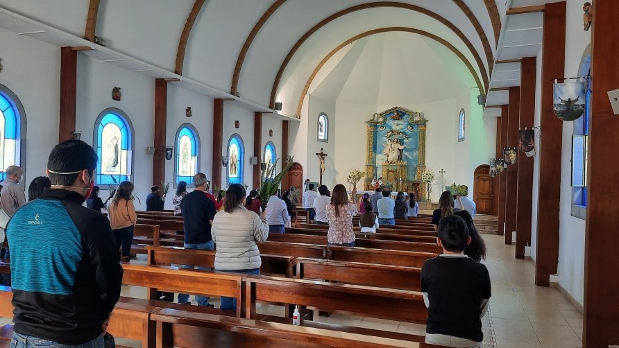 Fieles asistentes a la capilla de María Madre de la Unidad, mientras el padre Eddy bendice los ramos.