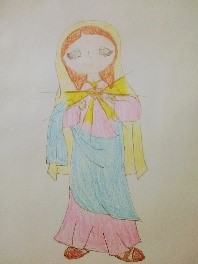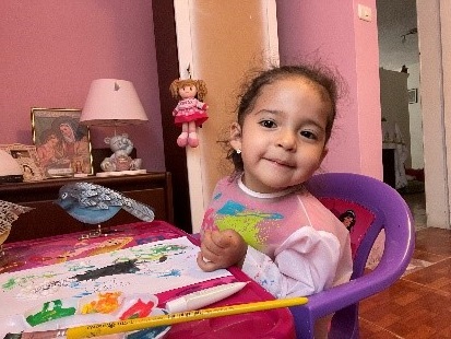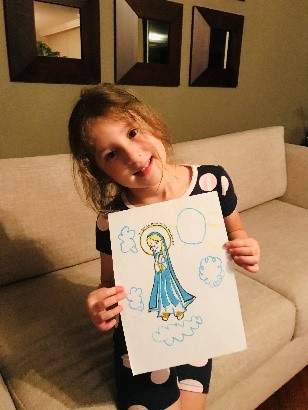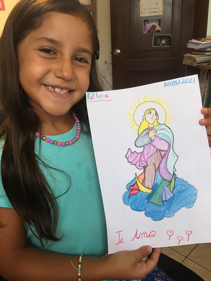 La pequeña: Fátima, sonríe feliz aprendiendo sobre La Asunción de María, Trabajos diestramente realizados por los niños más grandes.