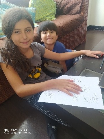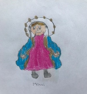 María Auxiliadora, Sara e Isabela Herrera muestran sus trabajos terminados, y Mauricio Redín dibujó a la Virgencita María con habilidad.