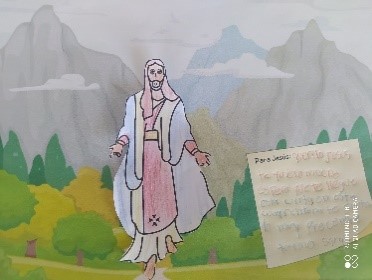 La actividad consistió en imprimir un paisaje que el niño elija de entre tres opciones. Luego imprimir al Maestro y pintarlo escogiendo las partes de su carita como cada niño prefiera, recortarlas y pegarlas donde corresponde. Luego recortar la figura e incluirla en el paisaje.