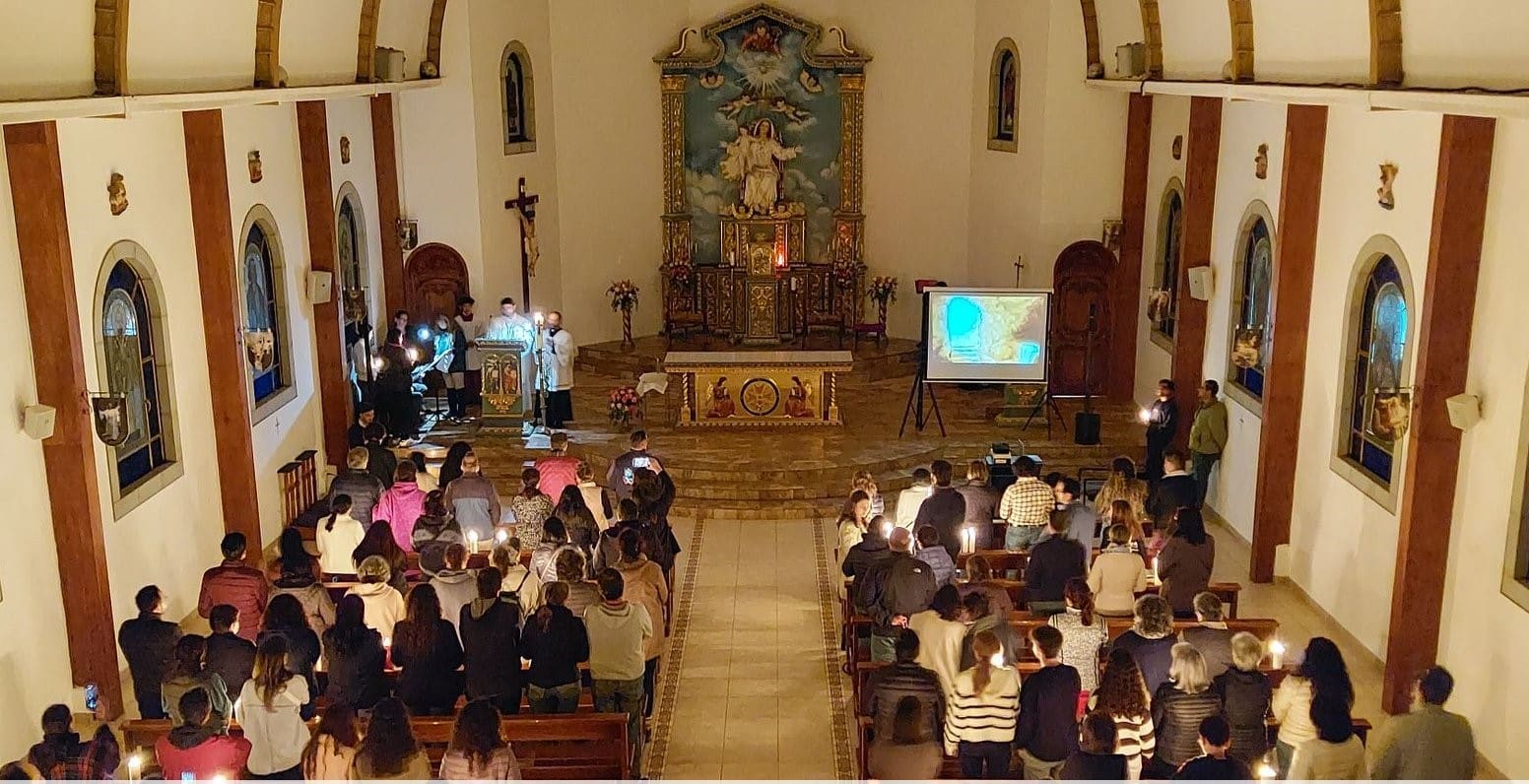 En la noche, con las luces apagadas dentro de la Capilla Madre y Reina de la Unidad, los asistentes nos congregamos afuera de la misma para encender el Cirio Pascual. En silencio y en procesión ingresamos a la iglesia y el padre Milton cantó el Pregón Pascual.