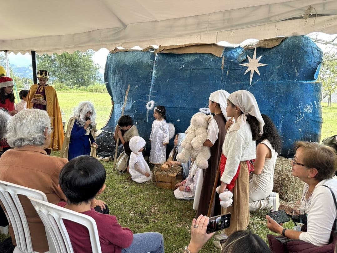 Luego de la celebración eucarística y de la bendición en la Gruta de la Gracia de Dios, los miembros de la Obra participamos de un ágape fraterno en las nuevas instalaciones de la Fundación “Resurgere”, en Tababela. Los niños de Nidos de Unidad llenaron de ternura y de sonrisas el ambiente, al representar El Nacimiento del Niño Jesús y la visita de los pastores y los Reyes Magos.