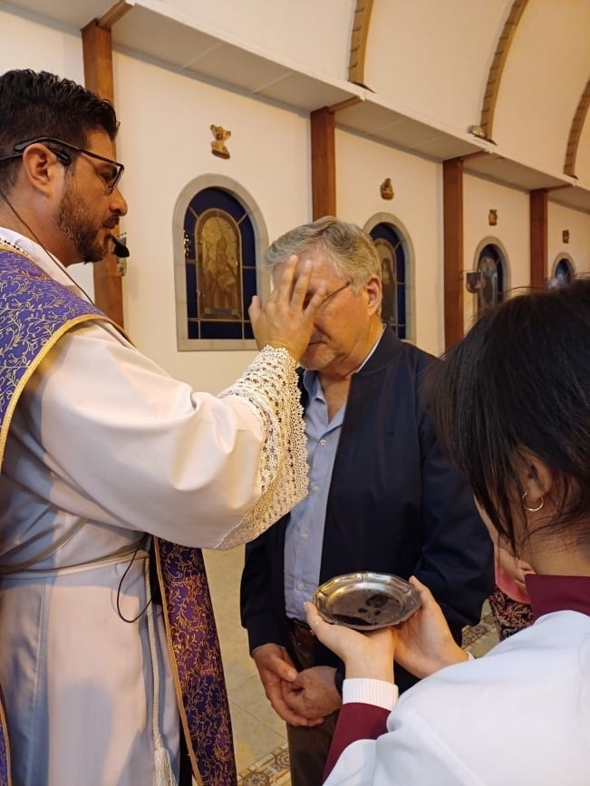 El padre Milton poniendo la ceniza durante la celebración de la Santa Misa