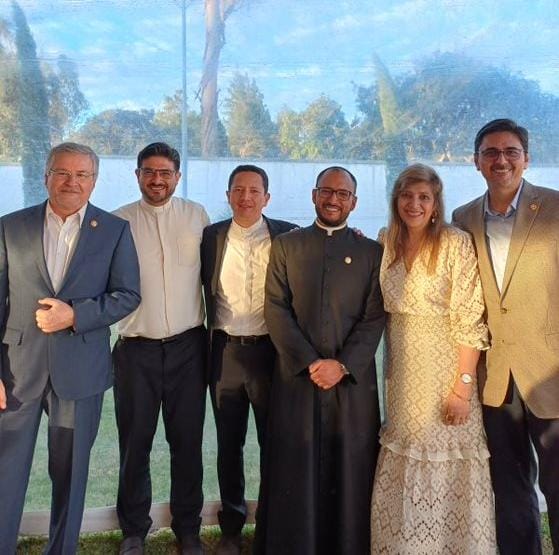 Juan, el padre Milton, el padre Eddy, el padre David, Marcia y Javier durante el ágape