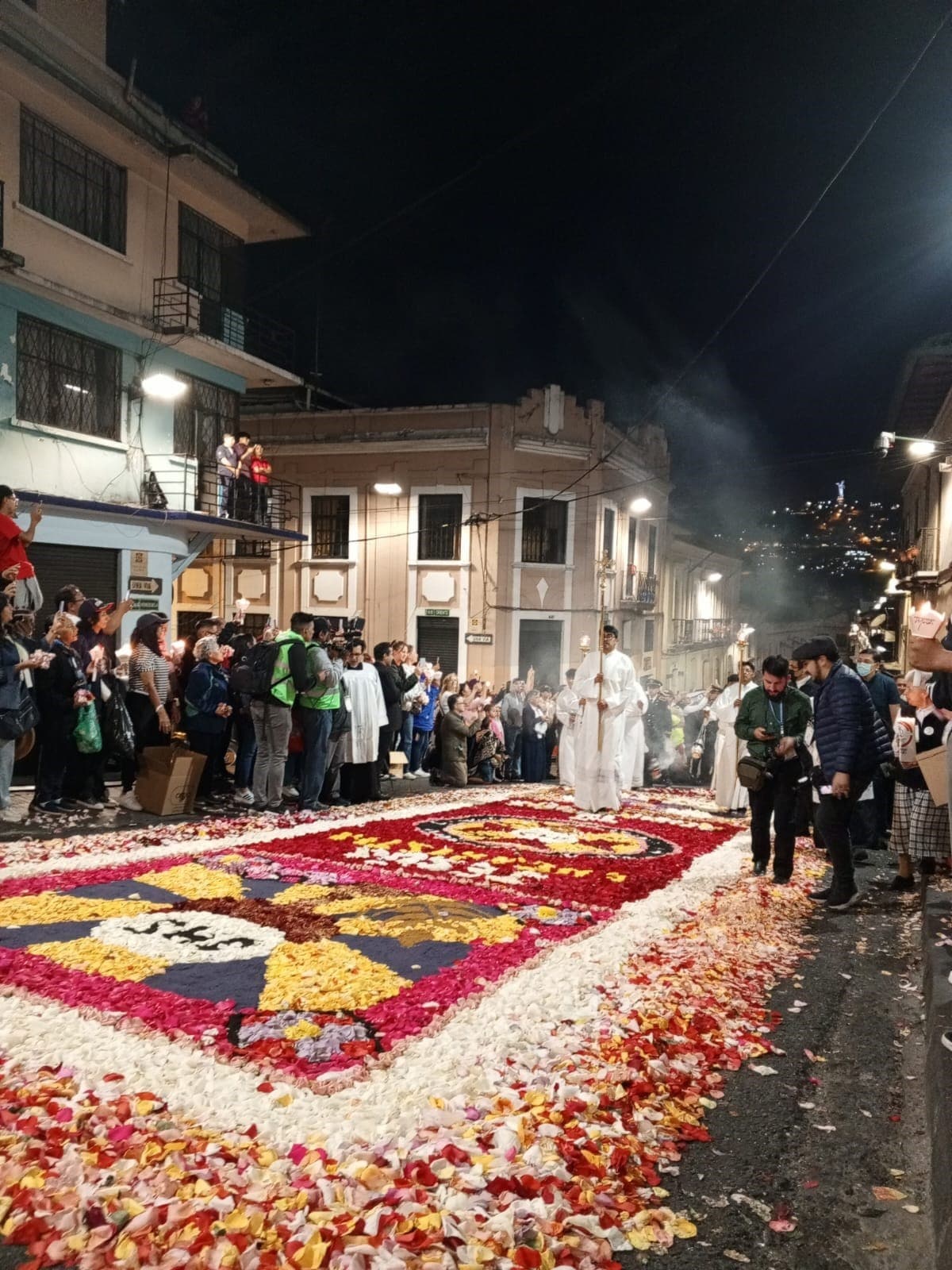 A la luz del atardecer, en el Centro Histórico y bajo la mirada de nuestra Madre, bellamente iluminada en el Panecillo, fuimos testigos, una vez más, de que cuando los corazones se unen, el resultado final va más allá de crear la más bella alfombra, pues, podemos resaltar y reflejar el Amor, la ternura y la Unidad que nuestro amado Maestro Jesús desea entregar al mundo entero.