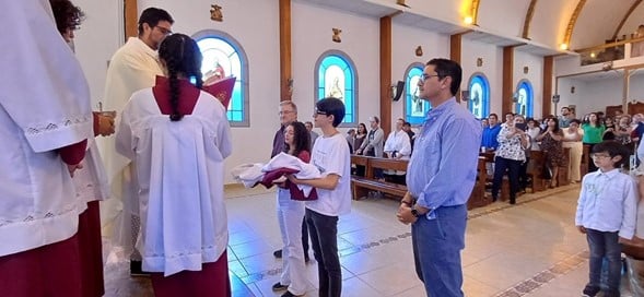 Un momento de mucha emoción y ternura se vivió cuando el padre Milton bendijo a dos jovencitos, Angie Proaño y Mauricio Redín, y los incorporó como nuevos monaguillos para el servicio del Altar. Tanto Angie como Mauricio llevaron en sus manos las sotanillas o albas rojas y los roquetes blancos, vestimenta con las que fueron revestidos por sus padrinos, Juan Arturo Crespo y Javier Dávila, respectivamente.