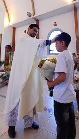 El padre Milton recibiendo las ofrendas de manos de un niño de la Casa de la Misericordia