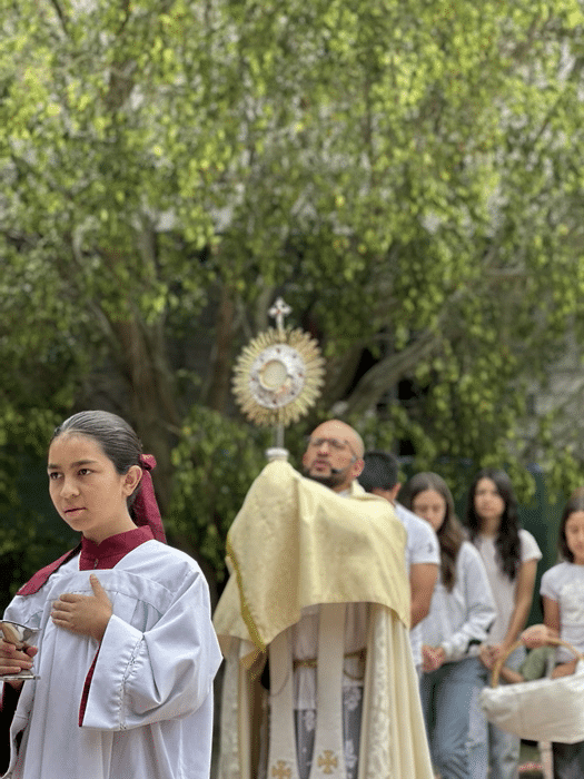 La procesión se realizó alrededor de una hermosa alfombra con la imagen de la Sagrada Eucaristía, que fue elaborada con pétalos de rosas, en medio del patio de nuestra capilla.