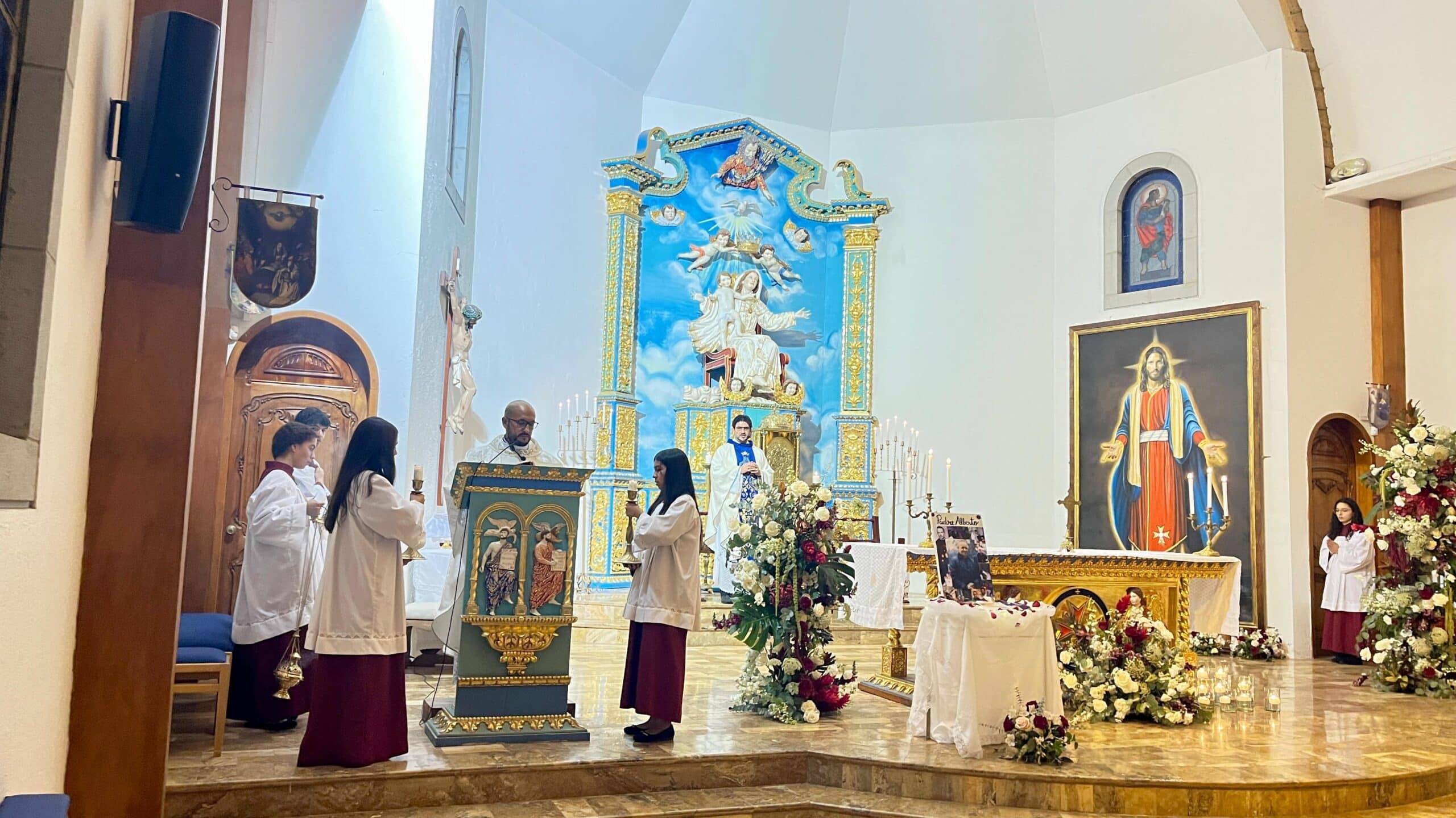 El padre Milton al fondo a los pies de la Reina de la Unidad y el padre David durante la homilía